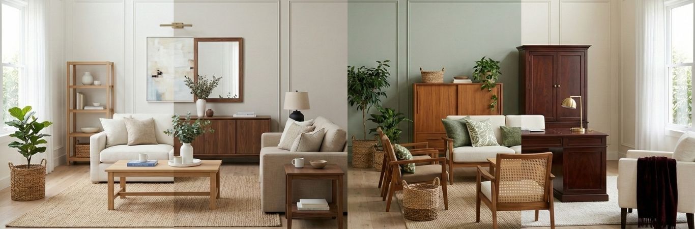 Dark walnut furniture against soft off-white walls feels elegant and defined. Pale oak against deeper painted walls feels contemporary and grounded. The contrast adds dimension without overwhelming the room.