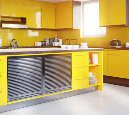 An elegant colour scheme with mustard yellow and classic black exudes sophistication and timelessness. Black provides a striking contrast to mustard yellow, enhancing its richness and making a bold statement. This combination is ideal for modern kitchens or stylish living areas, offering a sleek and upscale look. The interplay of these two colours can also highlight architectural features and create a dramatic focal point.