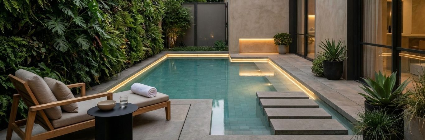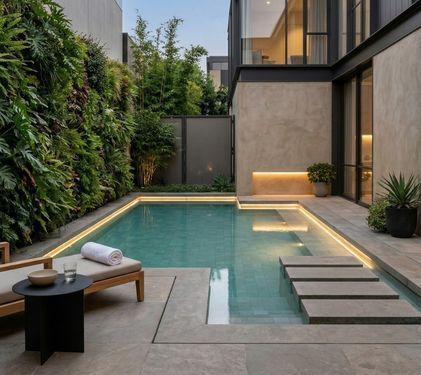 A sleek, minimal pool placed beside your living or lounge area creates a seamless indoor-outdoor connection. The view of still water adds calm to gatherings and daily routines alike.