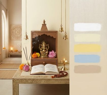 Soft shades like Buttercup, Mellow Yellow, or Golden Glow work well for pooja room walls.