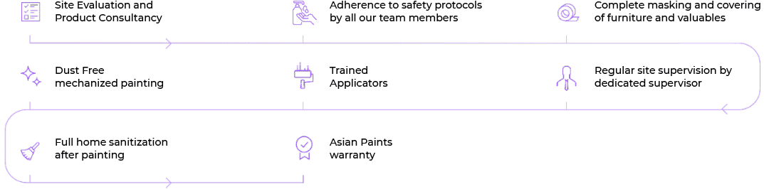The promise of best product come with the assurance of the Asian Paints Safe Painting service. The applicators are equipped with PPE kits, gloves and masks etc to ensure safety precautions in all ways.