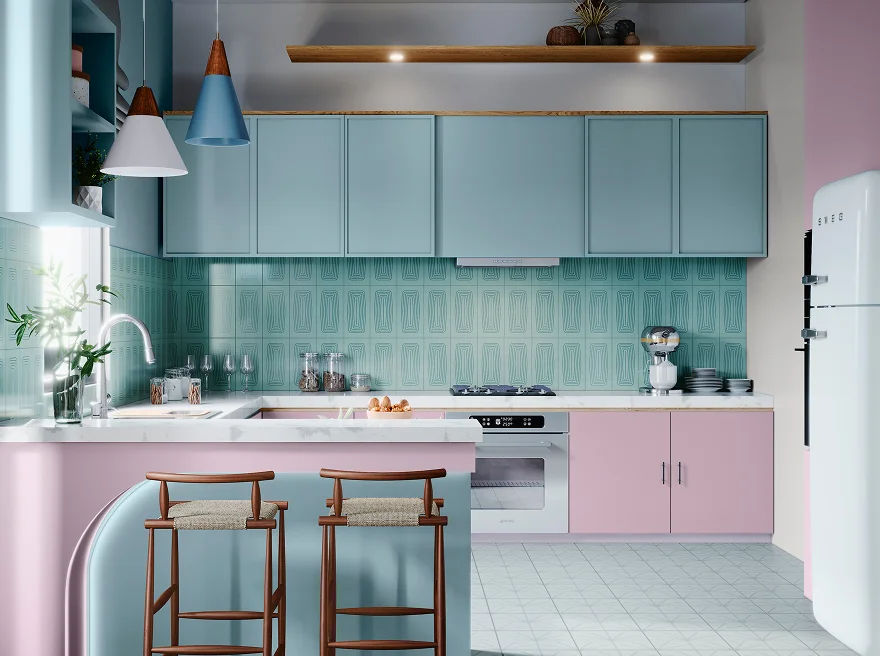 Blue and pink kitchen with two-tone cabinets